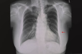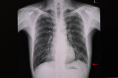 RTG klatki piersiowej pacjenta po lewej torakotomii płuc (chirurgiczne usunięcie płuca). Pacjent ma również złamane prawe żebro..