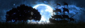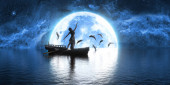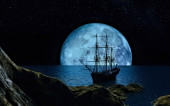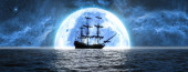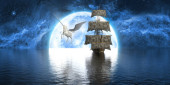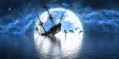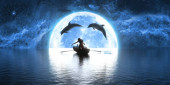 statek i stado żartobliwych delfinów na tle dużej pełni księżyca, ilustracja 3D