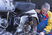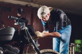 Senior badający swój motocykl i naprawiający silnik