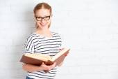 Złośliwy rudzielec w okularach ściskający podręczniki i spoglądający zza książki podczas studiów szkolnych na żółtym tle