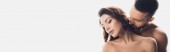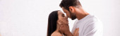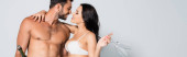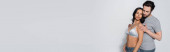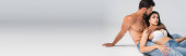 panoramiczna koncepcja seksownej kobiety w białym staniku patrzącej w kamerę i dotykającej twarzy muskularnego mężczyzny odizolowanego na szaro