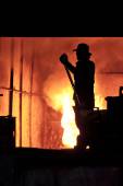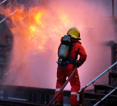 Abstrakcyjne zamazane tło strażaków używających gaśnicy na mgłę wodną do walki z płomieniem ognia w dużym budynku. Koncepcja bezpieczeństwa pożarowego i przemysłowego oraz usługi publicznej.