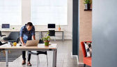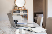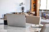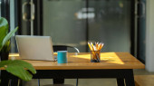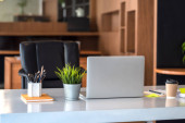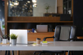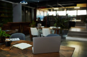 Laptop, notebook i okulary siedzące na biurku w dużej otwartej przestrzeni biurowej po godzinach pracy