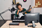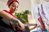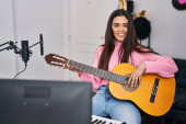 Portret pięknej młodej brunetki, artystki siedzącej w studiu nagraniowym i grającej na ukulele