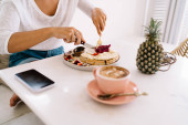 Zdjęcie "przycięty widok dziecka biorącego babeczkę z talerza w pobliżu mamy trzymającej sok pomarańczowy na rozmytym tle" może być wykorzystywane do celów osobistych i komercyjnych zgodnie z warunkami zakupionej licencji Royalty-free. Obraz jest dostępny do pobrania w jakości wysokiej rozdzielczości do 5760x3840.