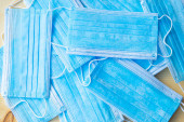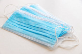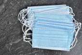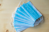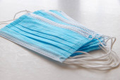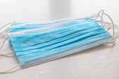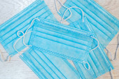 Niebieskie maski chirurgiczne na drewnianej powierzchni