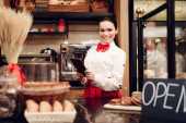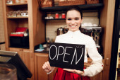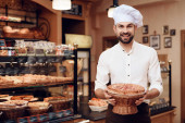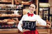 Zdjęcie "Młody szczęśliwy człowiek z otwartym znakiem stojący w piekarni." może być wykorzystywane do celów osobistych i komercyjnych zgodnie z warunkami zakupionej licencji Royalty-free. Obraz jest dostępny do pobrania w jakości wysokiej rozdzielczości do 5760x3840.