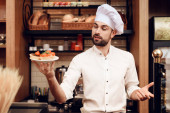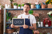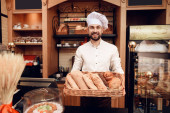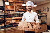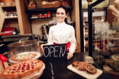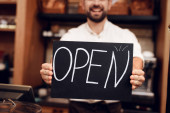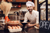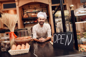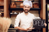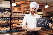 Młody szczęśliwy człowiek z otwartym znakiem stojący w piekarni.