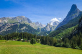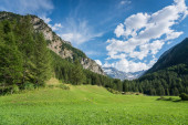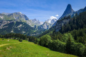 Krajobraz górski i pastwiskowy w Pralognan la Vanoise. Alpy francuskie