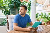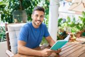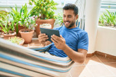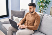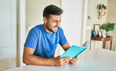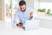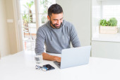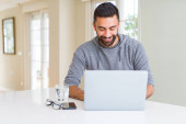 młody przystojny mężczyzna uśmiech szczęśliwy praca za pomocą laptopa w domu