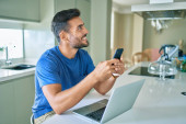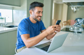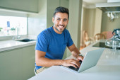 Zdjęcie "młody przystojny mężczyzna uśmiech szczęśliwy praca za pomocą laptopa w domu" może być wykorzystywane do celów osobistych i komercyjnych zgodnie z warunkami zakupionej licencji Royalty-free. Obraz jest dostępny do pobrania w jakości wysokiej rozdzielczości do 5760x3840.