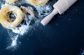 ingredients for homemade pasta. Food background: macaroni, spagetti, egg, flour