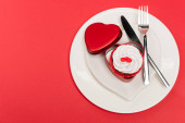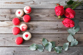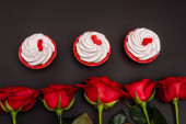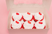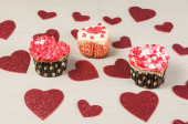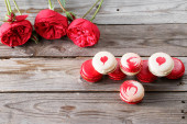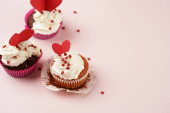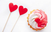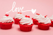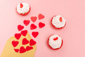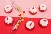 widok z góry serca i babeczki na czerwonym i różowym tle