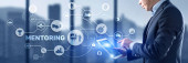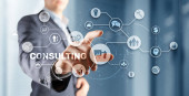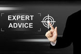 Ekspercka rada. Businessman strony dotykając napis na wirtualnym ekranie.