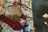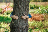 Dziecko przytulające drzewo w ciemnym lesie, dbające o planetę.