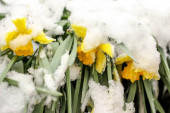 Wiosenny ogród podczas załamania pogody - kwitnące żółte żonkile kwiat pokryty śniegiem w zbliżeniu