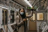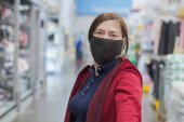 Kobieta w masce i rękawiczkach przeciwko wirusowi wybrać mięso wieprzowe w sklepie spożywczym