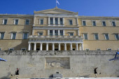 Turyści spacerują przed budynkiem greckiego parlamentu