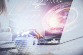 Podwójna ekspozycja kobiecych rąk wpisując na komputerze i social network motyw hologram rysunek. Koncepcja mediów.