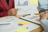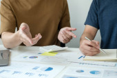 Praca koncepcyjna z domu. Dwóch liderów biznesu rozmawia o wykresach, wykresy finansowe pokazujące wyniki analizują i obliczają strategie planowania, procesy budowania sukcesu biznesowego.