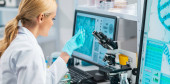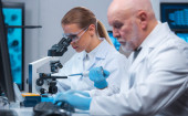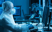 Inżynier mikroelektroniki pracuje w laboratorium naukowym nad systemami komputerowymi i mikroprocesorami. Profesjonalny pracownik fabryki elektroniki testuje płytę główną i koduje firmware.