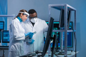 Zdjęcie "Inżynier mikroelektroniki pracuje w laboratorium naukowym nad systemami komputerowymi i mikroprocesorami. Profesjonalny pracownik fabryki elektroniki testuje płytę główną i koduje firmware." może być wykorzystywane do celów osobistych i komercyjnych zgodnie z warunkami zakupionej licencji Royalty-free. Obraz jest dostępny do pobrania w jakości wysokiej rozdzielczości do 5760x3840.