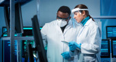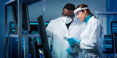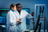 Zdjęcie "Różnorodny zespół inżynierów mikroelektronicznych omawia bieżące wydarzenia w laboratorium naukowym. Miejsce pracy projektantów mikroprocesorów. Koncepcja innowacji i wynalazków przyszłości." może być wykorzystywane do celów osobistych i komercyjnych zgodnie z warunkami zakupionej licencji Royalty-free. Obraz jest dostępny do pobrania w jakości wysokiej rozdzielczości do 5760x3840.