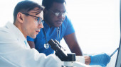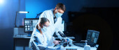 Różnorodny zespół inżynierów mikroelektronicznych omawia bieżące wydarzenia w laboratorium naukowym. Miejsce pracy projektantów mikroprocesorów. Koncepcja innowacji i wynalazków przyszłości.