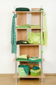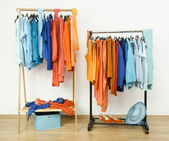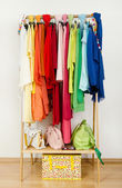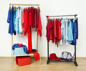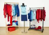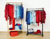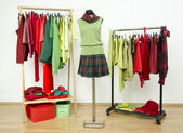 garderoba szafa z kolory dopełniające to kolory czerwony i zielony odzież ułożone na wieszaki.