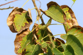 Wielokolorowe liście na gałęziach drzewa w parku miejskim. Liście są oświetlone przez poranne słońce..