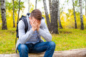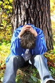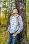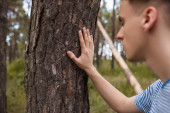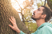 Młody człowiek zamknij oczy i przytul Bagażnik Drzewa w lesie