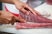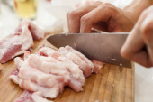 Kucharz kroi mięso wieprzowe nożem. Pojęcie gotowania