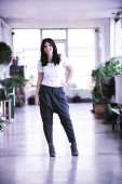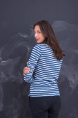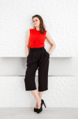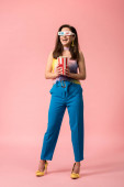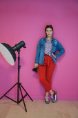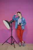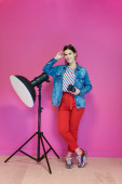 Zdjęcie "Portret szczęśliwej uśmiechniętej młodej pięknej kobiety w geście prezentu z otwartą dłonią odizolowaną na fioletowym tle. Kobieta model w nowoczesnym modnym ubraniu pozowanie w studio" może być wykorzystywane do celów osobistych i komercyjnych zgodnie z warunkami zakupionej licencji Royalty-free. Obraz jest dostępny do pobrania w jakości wysokiej rozdzielczości do 5760x3840.