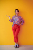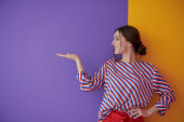 Portret szczęśliwej uśmiechniętej młodej pięknej kobiety w geście prezentu z otwartą dłonią odizolowaną na fioletowym tle. Kobieta model w nowoczesnym modnym ubraniu pozowanie w studio