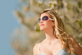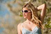 blond kobieta z okulary cieszyć się słoneczny dzień