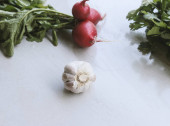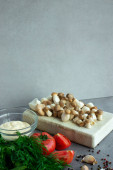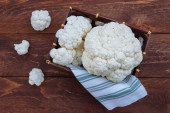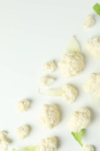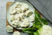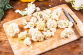 Nad głową zdjęcie świeżo krojonych kalafiorów na desce do krojenia