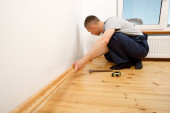 Prawdziwe zdjęcie podczas prac remontowych, malowanie pustych ścian w pokoju.