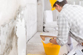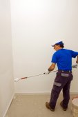 Prawdziwe zdjęcie podczas prac remontowych, malowanie pustych ścian w pokoju.
