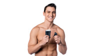 bez koszulki mężczyzna przycinający brodę elektrycznym przycinaczem izolowanym na szaro