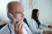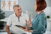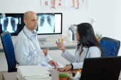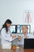 Lekarz zalecając butelkę nowych tabletek do kolegi, który robi notatki w dokumencie na schowku
