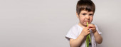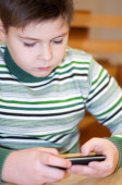A small child boy 3-4 years old looks into the phone screen. Parental control of content, internet and cartoons in the childs life, distance from eyes to the screen, spoils vision.