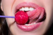 Zdjęcie "Dziewczyna z seksownymi ustami jedząca chupa chups z bliska. Kobiece usta ssące lizaki. Kobieta trzymająca lizaka w ustach, zbliżenie. Czerwone usta, zmysłowa i seksowna koncepcja." może być wykorzystywane do celów osobistych i komercyjnych zgodnie z warunkami zakupionej licencji Royalty-free. Obraz jest dostępny do pobrania w jakości wysokiej rozdzielczości do 5760x3840.