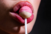 Dziewczyna z seksownymi ustami jedząca chupa chups z bliska. Kobiece usta ssące lizaki. Kobieta trzymająca lizaka w ustach, zbliżenie. Czerwone usta, zmysłowa i seksowna koncepcja.