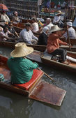 Tajski człowieka w tradycyjne tkaniny w pływających rynku