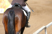 Nieznany zawodnik jeżdżący na koniu skoczka pokazowego na zawody jeździeckie czas letni. Pokaż konia skoków pod siodłem w akcji