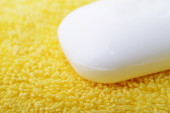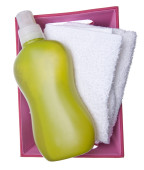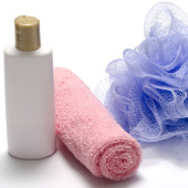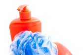 koncepcja kąpiel spa z gąbki puf i fioletowy bubble bath