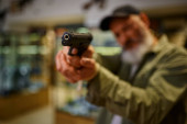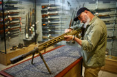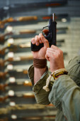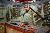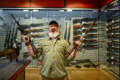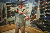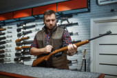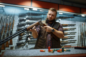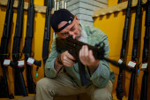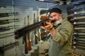 Brodaty mężczyzna trzyma pistolet na wystawie w sklepie z bronią