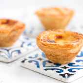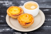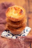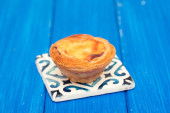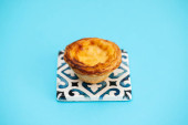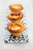 typowa portugalska tarta jajeczna pastel de nata na szarym ceramicznym tle