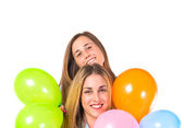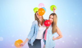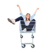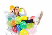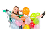 dziewczyna z wielu balonów wewnątrz supermarketu koszyk na białym tle