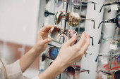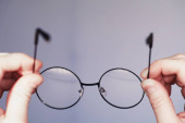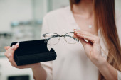 Kobieca ręka z modną soczewką. Okulary przezroczyste diopter